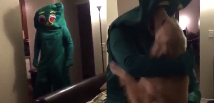Pour faire plaisir à son chien, ce gars a décidé de se déguiser comme le jouet préféré de celui-ci : Gumby.