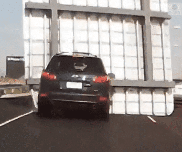 Un panneau d’autoroute cède soudainement et tombe sur une voiture, au passage. Le conducteur s’en sort presque indemne.