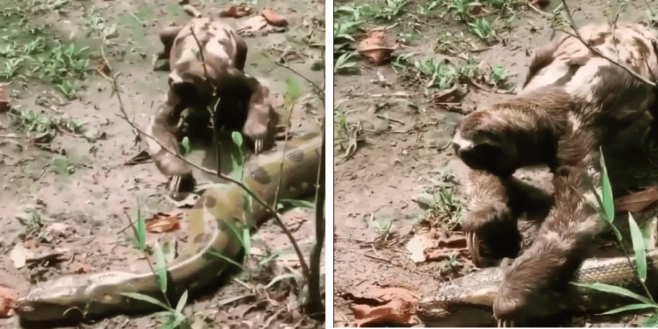 Ce paresseux n’est pas du tout inquiet en passant à côté d’un anaconda. Il lui marche dessus sans aucune crainte. L’énorme serpent ne semble pas très enthousiaste face à cette boule de poils.