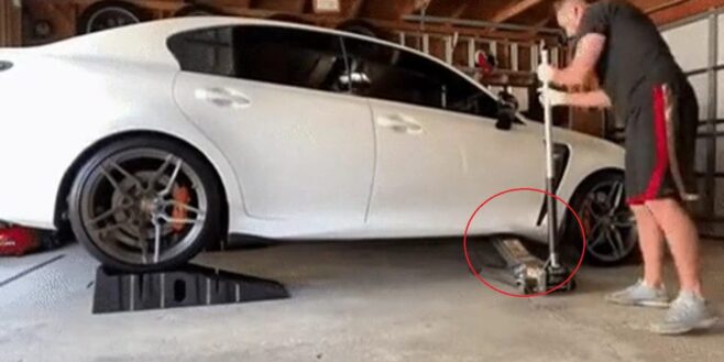 Mais, malheureusement pour lui, il va changer d’autres choses avec le pneu parce qu’il a ruiné sa voiture en essayant de la faire élever avec le pont.