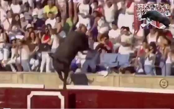 Le spectacle a viré au drame pour ces personnes venues nombreuses pour assister à une tauromachie. Dans l’arène, le taureau se met à courir. D’un coup de tête et très furieux, l’animal saute au-dessus de l’enclos qui le sépare du public. Il saute et atterrit sur les gradins. Dans un accès de rage, le taureau s’en prend à ceux qui se trouvent sur sa route. Certains tentent de tirer sur sa queue, mais ne font qu’attiser la colère de cette énorme bête. La scène est désolante, avec un animal effarouché qui cherche désespérément de se libérer de son enfer.