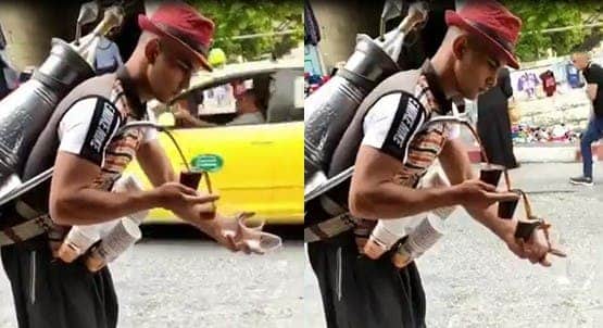 En vendant une boisson dans la rue, la technique de ce jeune homme impressionne. Il peut servir cinq verres en une seule fois avec le récipient qui est accroché dans son dos.