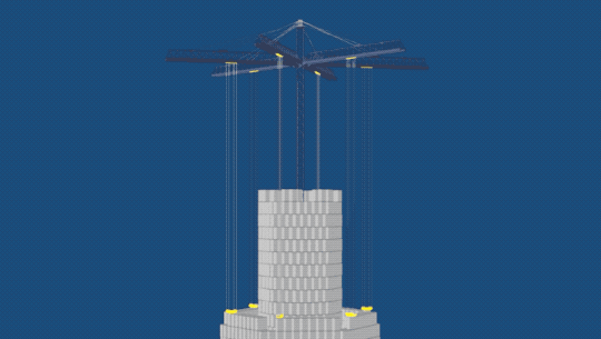 Le logiciel du système analyse les signaux du réseau électrique pour contrôler automatiquement les grues, qui soulèvent et abaissent soigneusement les briques géantes tout en tenant compte du vent et du temps.