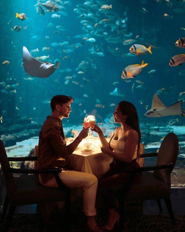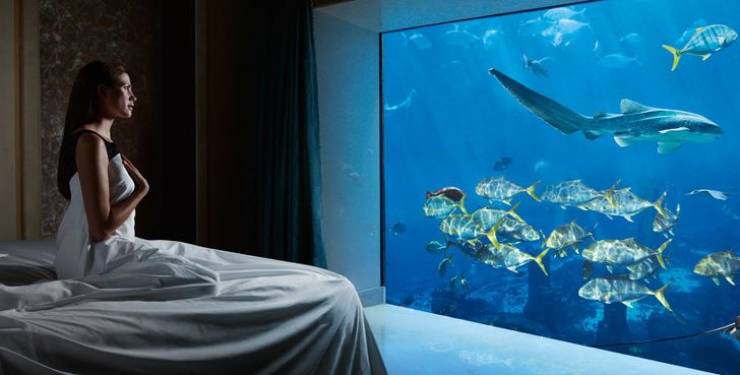 Atlantis, The Palm à Dubaï est un grand complexe hôtelier proposant des chambres sous-marines et des restaurants dotés de baies vitrées donnant sur un lagon de récifs coralliens.