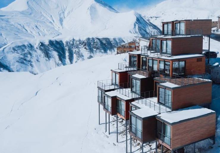 L’hôtel Quadrum est situé dans la chaîne de montagnes du Caucase en Géorgie. Il mesure 7 217 pieds (2 200 mètres) et est entièrement fabriqué à partir de conteneurs d’expédition!