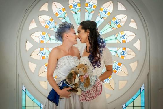 Pour s’assurer que leur peau ne brûle pas, les mariées – qui ont commencé à sortir ensemble en 2013 et se sont fiancées en 2016 – portaient des leggings en coton pour protéger leurs jambes et ont noué leurs cheveux.