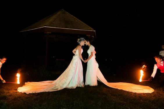 À la tombée de la nuit, les mariées – qui portaient chacune des robes différentes pour prononcer leurs vœux – ont demandé à deux de leurs invités d’asperger leur tenue d’essence. Puis, sur le bref ordre « Vous pouvez maintenant allumer la mariée », ils ont enflammé les traînes.