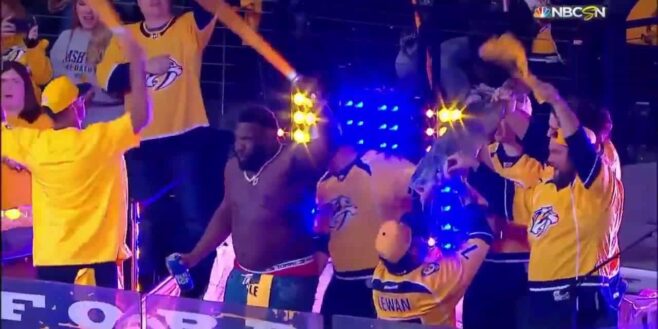 Pourtant, en 2017, l’entraîneur de Nashville Peter Laviolette avait exhorté les supporteurs de son équipe d’arrêter une forme particulière d’encouragements, l’envoi de poissons-chats sur la glace en plein match lors de la finale de la Ligue nord-américaine de hockey sur glace (NHL). Désormais, ils boivent à travers lui !