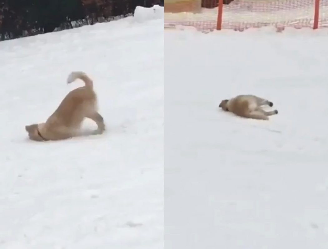 Sans même utiliser une plaque, ce chien se pose directement sur la neige et commence à glisser du haut d’une petite colline jusqu’à atteindre le bas.