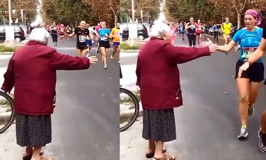 Cette adorable vieille dame a été filmée en vidéo donnant des « high five » aux participants passants lors d’un marathon.