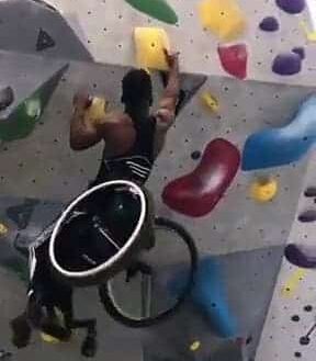 Qui a dit que le fauteuil roulant était un handicap ? Pas pour cet homme qui nous montre sa puissance et son agilité en escaladant ce mur avec ces prises multicolores.