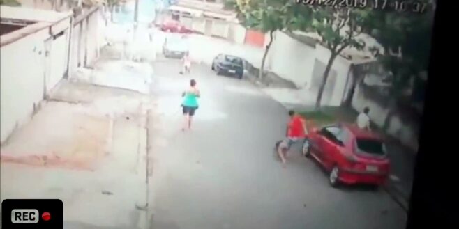 Une scène terrible ou un pitbull attaque un enfant. Un homme (en rouge) va tout faire pour sauver l’enfant de ne pas se faire dévorer par le chien. Il va placer l’enfant sur la voiture et va même le rejoindre étant donné la violence de ce chien.
