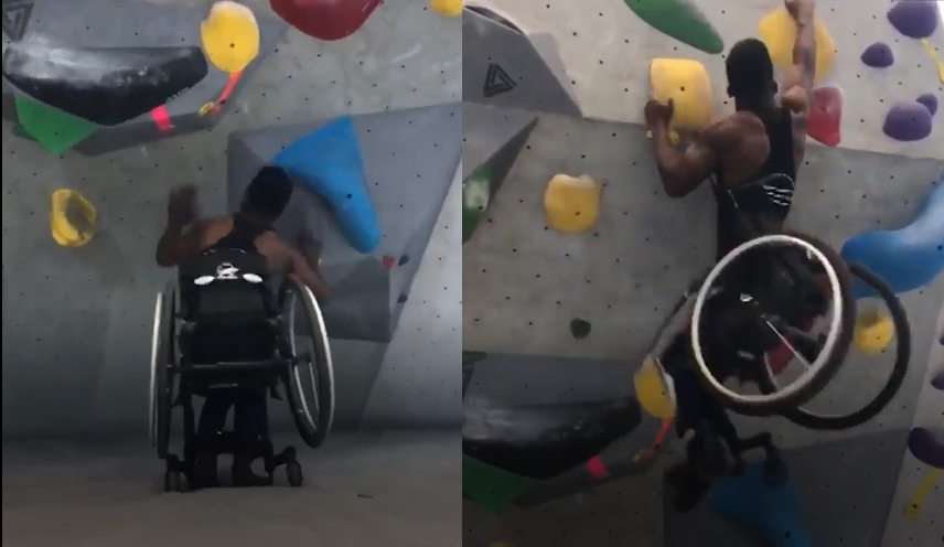 Avec sa chaise roulante, cet homme en situation de handicap réussit sans problème à faire de l’escalade.