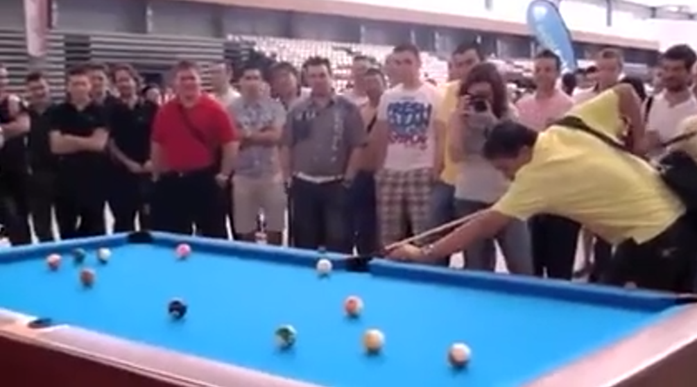 Un homme du public surprend tous ceux qui sont présents autour d’une table de billard, lorsqu’on lui demande de relever un défi. Il y arrive sans problème, sans même déposer son sac au dos.