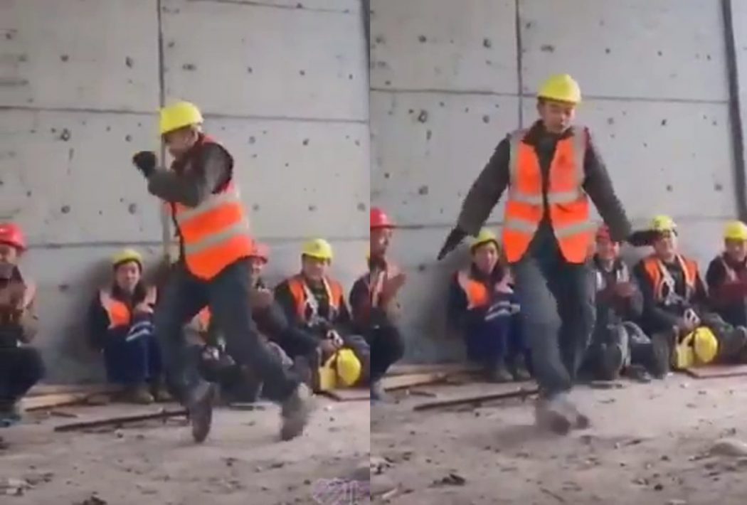 Cet ouvrier de construction sait comment se divertir et divertir ses collègues aussi.