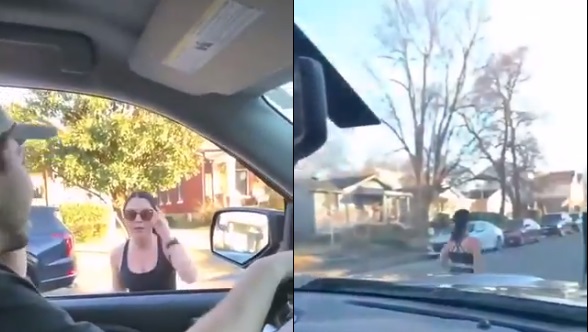 Cette femme s’emporte et se montre agressive pensant qu’elle se faisait harceler par un automobiliste qui multiplie les coups de phares et de klaxon.