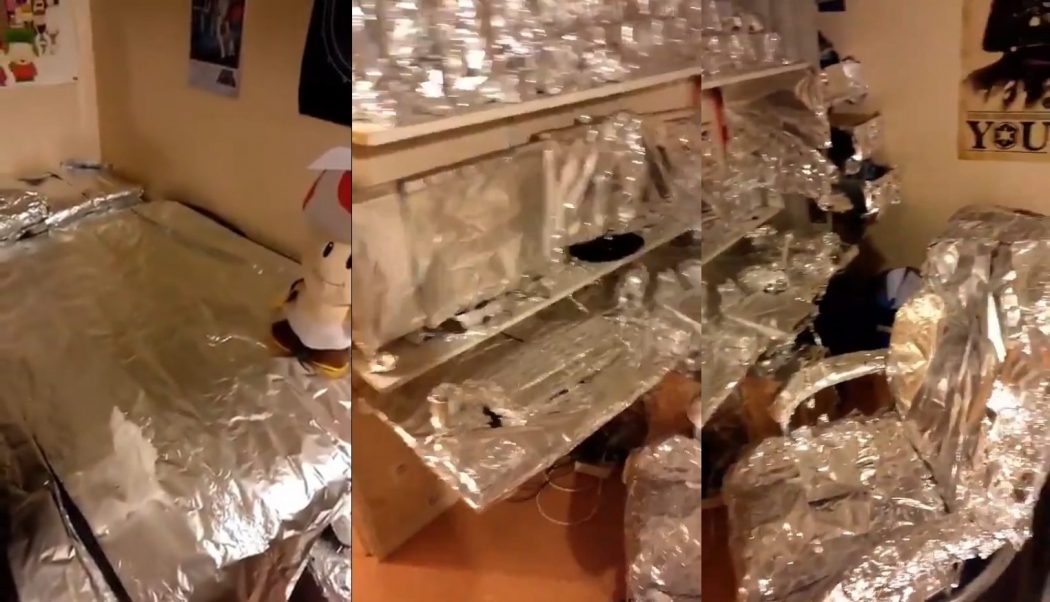 Elle a donc emballé entièrement sa chambre en utilisant 200 mètres de papier aluminium. Elle n’a littéralement rien laissé; le bureau, le lit, la chaise, l’ordinateur, les trophées, etc.