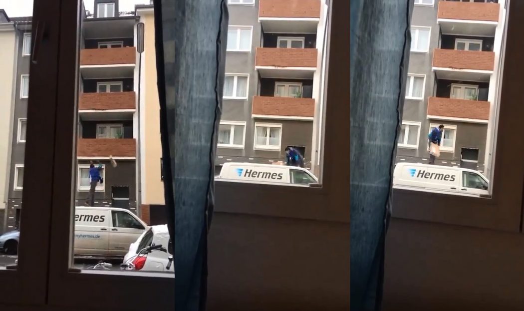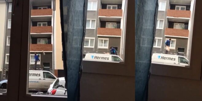 Un livreur de « Hermès », qui devait effectuer une livraison probablement au premier étage, a été filmé montant sur le toit de sa camionnette et jetant un grand colis vers le balcon d’une maison.