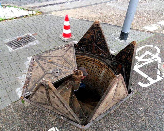 La façon dont cette grille d’égout s’ouvre, rappelle l’entrée d’un donjon de dragon. Si ça se trouve il y a un monstre au fond de cet égout.