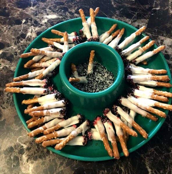 Une idée de génie et un vrai trompe l’œil. Des Bretzels trempés dans du chocolat blanc avec des paillettes sur les pointes, donnant un effet cigarette.