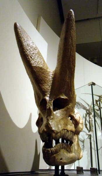 Un crâne d’arsinoitherium exposé dans un musée. La maquette semble tout droit sortie d’un film de fiction.