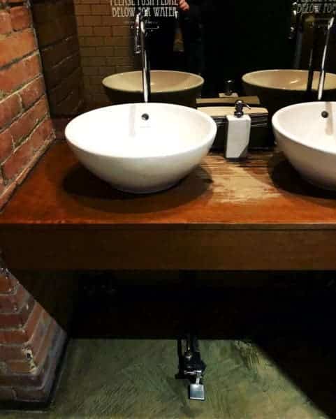 Une salle de bain révolutionnaire et pratique. Pour activer le robinet, il faut juste appuyer sur la pédale.
