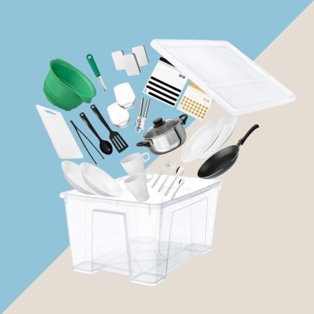 Des produits de cuisine indispensables pour préparer les repas. Comme une batterie de cuisine de cinq pièces, un ensemble d’ustensiles ou encore des verres et des mugs.