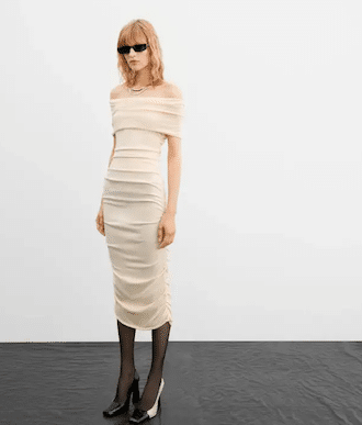 Ce qui en fait donc une pièce phare de la collection de la marque. En bref, la robe drapée à épaules dénudées de Mango témoigne de l’élégance naturelle que la marque sait offrir.