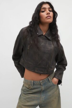 Ce modèle court de chez Stradivarius « effet usé » se distingue par son col à revers et ses manches longues zippées. Il possède une fermeture Éclair métallique croisée sur le devant, ainsi qu’une poche zippée et plaquée sur la poitrine.