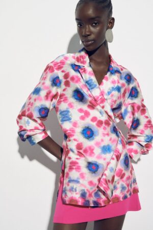 Ce qui distingue également cette veste Zara, c’est son imprimé unique. Arborant un motif original en rose et bleu sur fond blanc, cette pièce ira avec toutes vos tenues.
