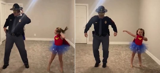 Pour ne pas la décevoir, il a fait en sorte que le spectacle ait lieu. Mais pour que ce soit plus réaliste, il a décidé de danser avec elle ! Ayant vu sa fille s’entraîner, l’officier de police était habitué à la chorégraphie et n’a pas eu trop de mal à danser avec elle devant la caméra.