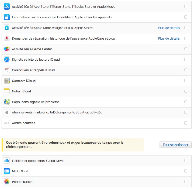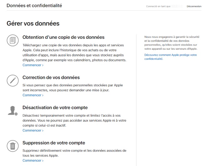 Toujours dans l’air du temps, et par souci de transparence, Apple a décidé de créer un site en ligne permettant à ses clients de télécharger toutes leurs données personnelles. Ainsi, vous pourrez en obtenir une copie, les modifier, et désactiver votre compte ou le supprimer définitivement. Toutes les données collectées par la firme de Cupertino sont concernées, qu’elles soient stockées sur iCloud, App Store ou encore dans votre historique AppleCare.