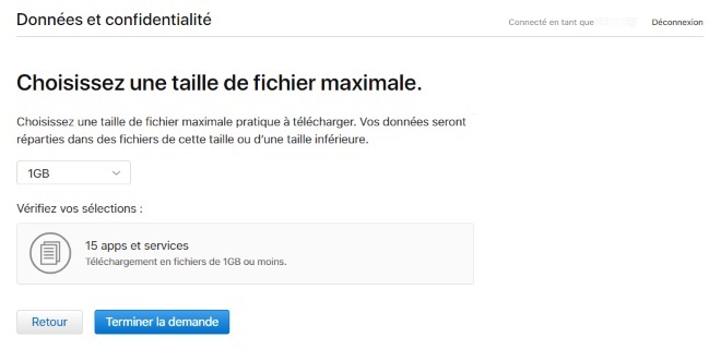 Une fois que vous aurez sélectionné les données que vous souhaiteriez récupérer, l’outil vous demandera la taille de fichier qui vous conviendra pour les recevoir, entre 1 et 25 Go. Si les données sont trop volumineuses, il vous sera possible de les fragmenter en plusieurs fichiers.