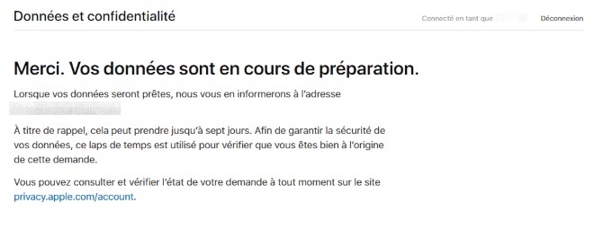 Après confirmation de votre demande, vous recevrez un e-mail qui vous expliquera le processus de récupération des données. Le téléchargement n’est pas instantané, car il pourra prendre environ sept jours.
