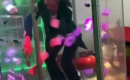 Cette femme a bonne la technique pour amasser un maximum de billets dans cette money chamber. Cette pièce vitrée où l’argent vole en tournoyant autour de la personne propose dans un temps limité de ramasser un maximum de billets de dollars/euros qui volent et de les placer dans cette boite afin de les récupérer à la fin du jeu.