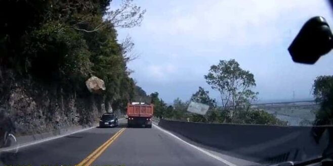 A quelques seconde près… ce conducteur se prenait ce rocher. Son jour de chance !