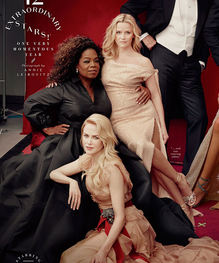 Trois mains pour Oprah Winfrey, trois jambes pour Reese Witherspoon il faut dire que la couverture de « Vanity Fair » fait polémique. Et pourtant ce fut la célèbre photographe Annie Leibovitz qui était derrière l’appareil. La photo d’ensemble rassemble Oprah Winfrey, Tom Hanks, Robert De Niro et Nicole Kidman et bien d’autres stars.