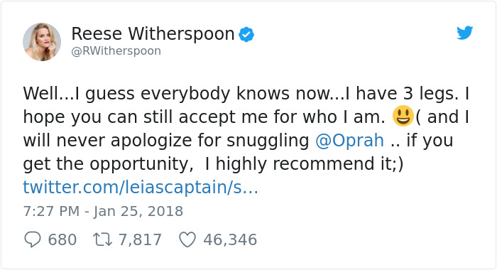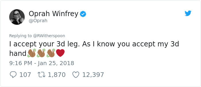 Après le tweet de Reese Witherspoon, la reine de la télévision américaine Oprah Winfrey, a à son tour twitté : « J’accepte ta troisième jambe. Tout comme je sais que tu acceptes ma troisième main. »