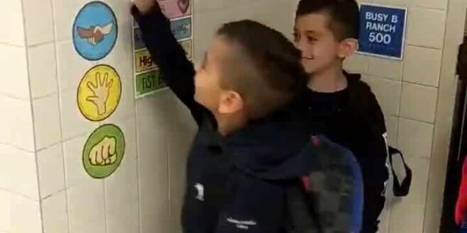 Les jeunes écoliers choisissent comment accueillir cet enfant en classe en le cherchant, lui faisant un câlin… C’est super cute !