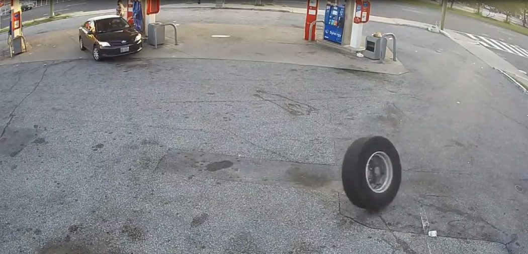 Pendant qu’elle s’est arrêtée dans un stationnement pour prendre du carburant, une femme a eu un petit accident vraiment inattendu. En effet, le pneu d’un poids lourd a roulé venant d’on ne sait pas où pour finir sur sa belle carrosserie.