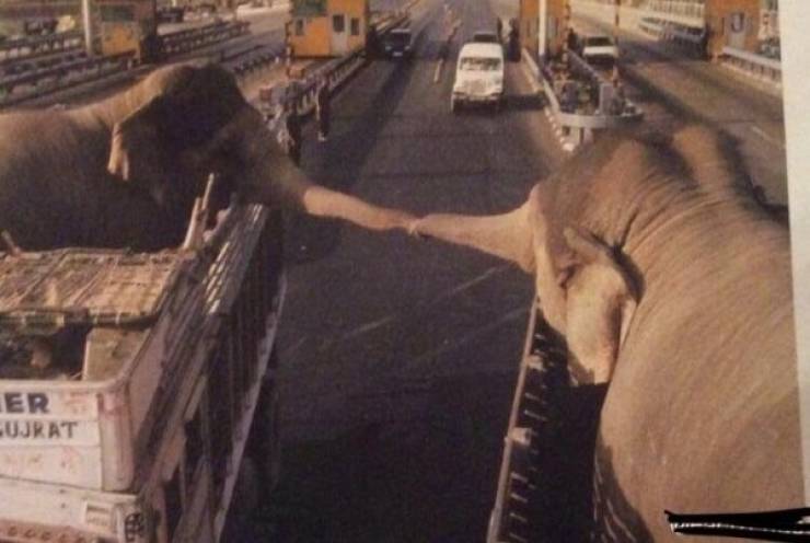 Deux éléphants se tiennent la trompe pour la dernière dans un moment d’étreint, avant d’être séparé l’un de l’autre.