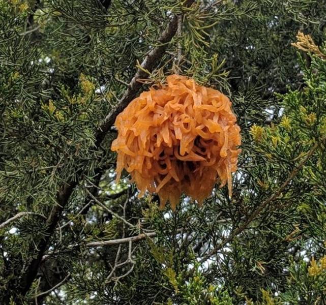 « Trouvé dans un arbre en Caroline du Nord. C’est à peu près la taille d’un poing. » Que penseriez-vous si vous voyiez quelque chose comme ceci suspendu à un arbre ? Cela semble effrayant, mais il n’y a pas de quoi s’inquiéter. Il s’agit de la rouille pomme de cèdre, un champignon à l’origine de la défiguration des feuilles et du fruit des plantes infectées.