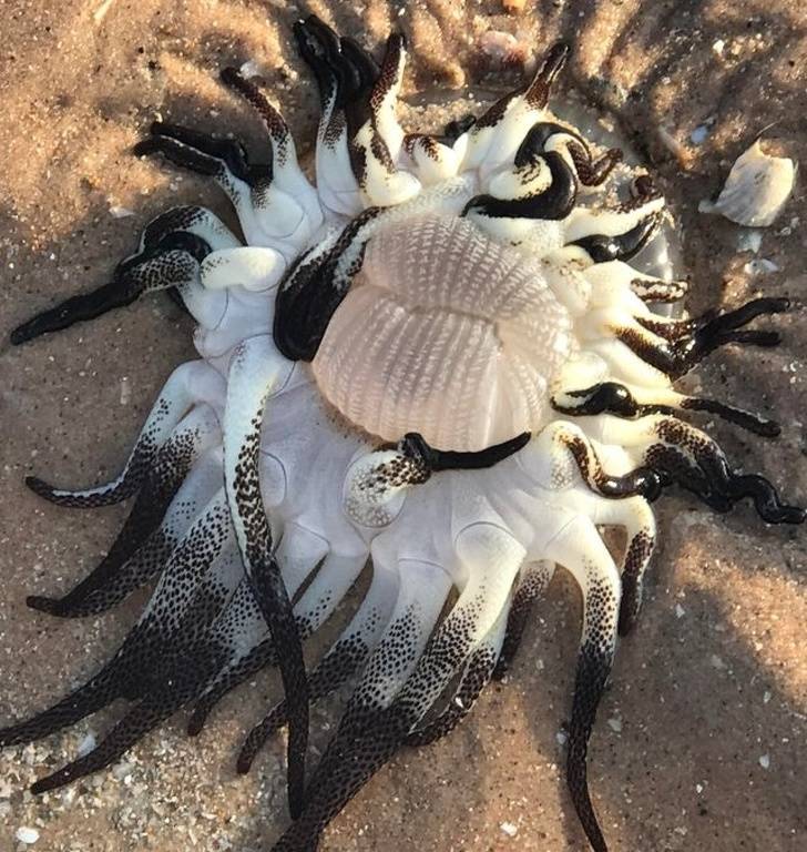 « Ma mère et ma copine l’ont trouvé sur la plage. Une idée de ce que c’est ?Cette créature d’un autre monde s’est avérée être une anémone de mer et de nombreuses personnes l’ont vue sur des rivages marins. Les anémones de mer sont des prédateurs marins de formes, de couleurs et de tailles variées. Ils sont des proches parents de coraux et de méduses et passent principalement leur vie attachée à des rochers.