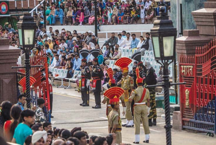 Chaque jour avant le coucher du soleil, des centaines de personnes se présentent à la frontière où de nombreux orateurs scandent des chansons pop et patriotiques indiennes et les jeunes gens de la foule seront encouragés à danser et se promener avec le drapeau indien pour le public pakistanais de l’autre côté de la frontière. Le spectacle se déroule dans une petite ville située à seulement 35 km d’Amritsar.