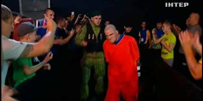 Menotté et accompagné par un militaire, Denys Berinchyk est habillé en prisonnier jusqu’au ring.