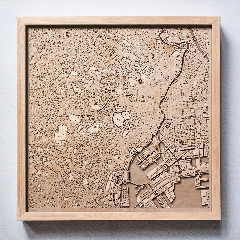 L’architecte Polonais a eu l’ingénieuse idée d’apporter une touche plus moderne aux travaux réalisés sur Atlas en créant des cartes de ville en version 3D. Pour ce faire, il a utilisé des couches de bois gravées au laser.