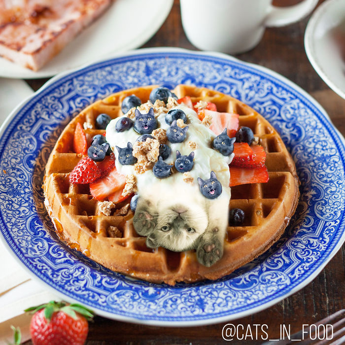 Grâce à des logiciels comme Photoshop, on peut matérialiser en photos les fruits de notre imagination. Comme ses chats dans les assiettes. Improbables mais bien exécutées Ksenia, une artiste Russe aime les chats et la nourriture.
