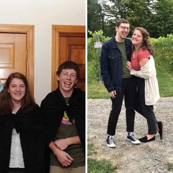La première photo avait lieu avant la première de minuit de Harry Potter et de l’Ordre du Phénix en juillet 2009. C’était un mois après le début de notre relation, entre la première année et la deuxième année du lycée. La deuxième photo est nous 10 ans plus tard, toujours ensemble et toujours en train de rire.