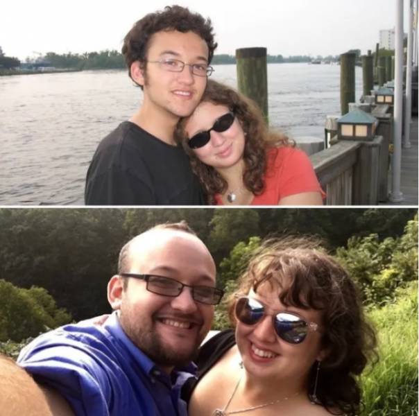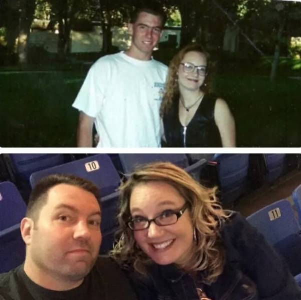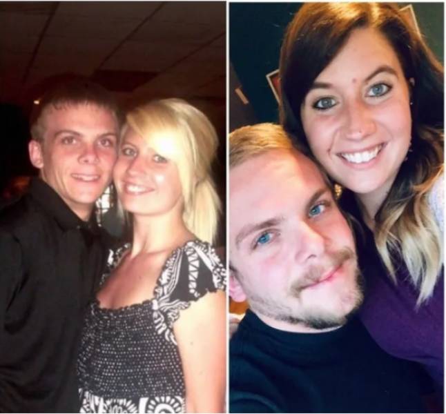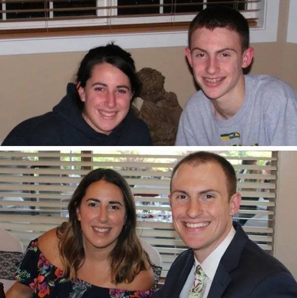La photo du haut est celle de 2004 lors de notre première année de lycée. Nous avons commencé à sortir ensemble environ six mois plus tard. La photo du bas est nous l’année dernière. Nous sommes ensemble depuis 13 ans et mariés depuis trois ans.