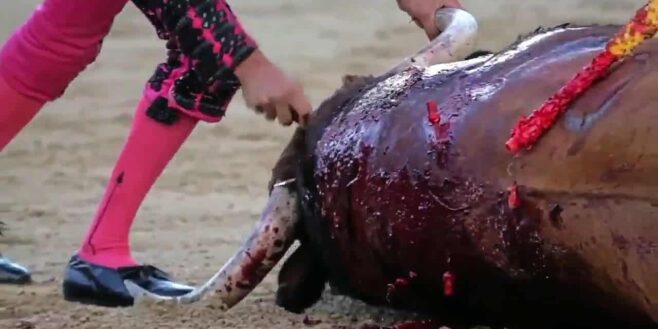 On n’a pas de mots devant cet acte de barbarie. Quelle tristesse de voir le taureau encore en vie, souffrir.